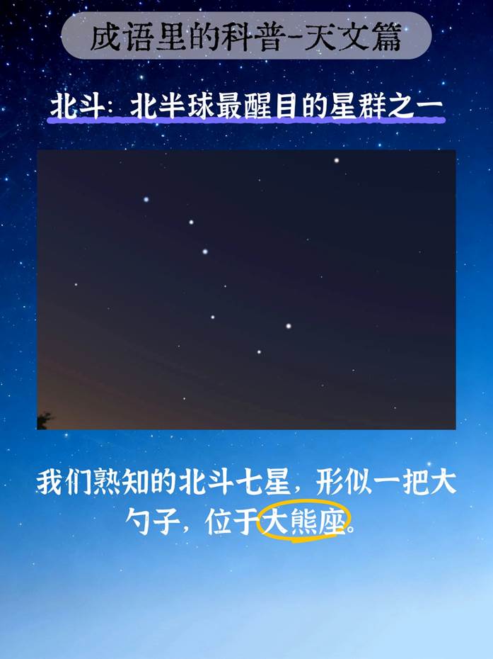 “北斗”就是我们熟知的北斗七星,位于大熊座,形状像一把大勺子,是北半球夜空中最醒目的星群之一。