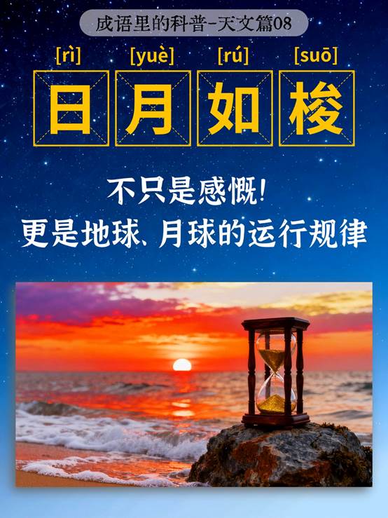 “日月如梭” 以梭子喻日月运行,形容时光飞逝,源于古人对天体规律的观察。“日” 是地球自转形成的太阳视运动,每日东升西落;“月” 是月球绕地公转,约 29.5 天完成圆缺,每日东移约 12 度。古人依此计时定节律,现代虽有精准计时,地球自转与月球公转的 “穿梭” 规律仍在,是时光飞逝的天文本质。