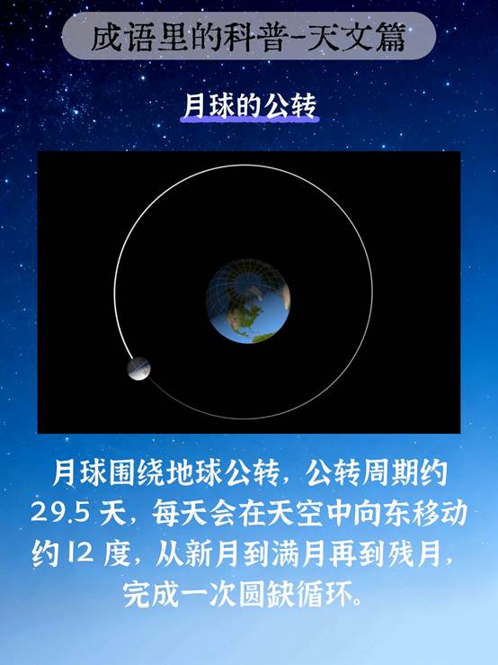 而 “月”,是月球围绕地球公转的体现:月球公转周期约 29.5 天,每天会在天空中向东移动约 12 度,从新月到满月再到残月,完成一次圆缺循环。