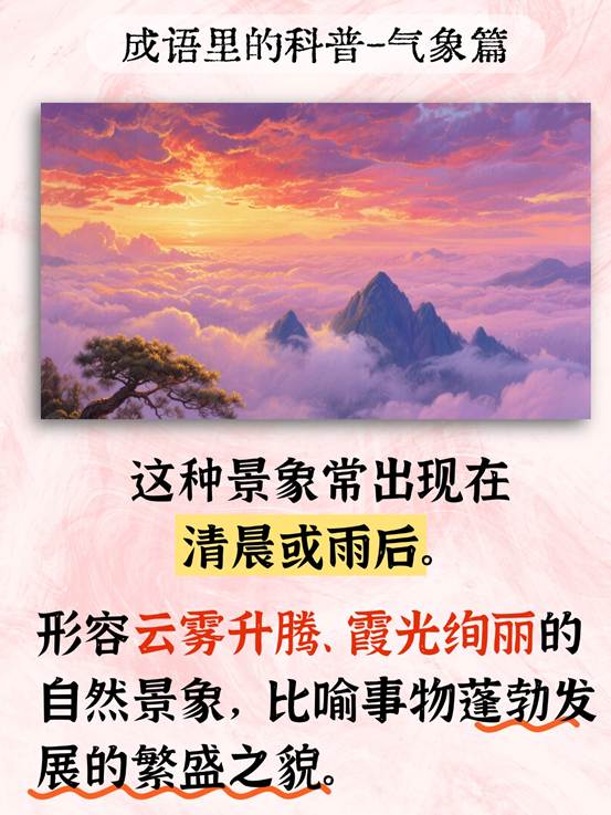 天边的云海像被谁悄悄煮沸,白雾翻涌着腾上山腰,朝霞的光从缝隙间倾泻下来,把每一团云染得温热而明亮。古人看见这样的景象,便有了“云蒸霞蔚”这个成语——云气像蒸腾的水汽,霞光像燃烧的锦绣,美得让人屏息。现用这个成语比喻事物蓬勃发展的繁盛之貌。