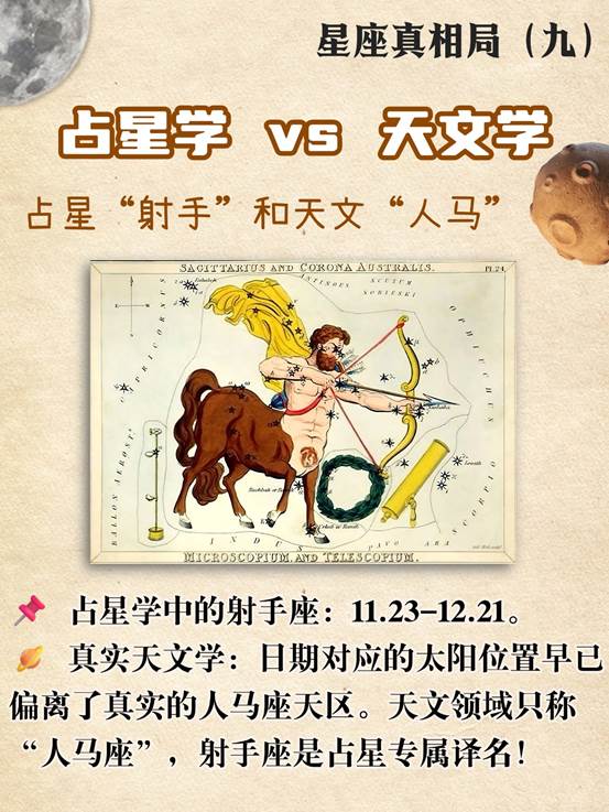占星“射手”和天文“人马”天文领域只称“人马座”,射手座是占星专属译名!占星学沿用巴比伦黄道十二宫,将射手座定为11.23-12.21。但天文学中,这个日期对应的太阳位置,早已因岁差偏离了真实的人马座(Sagittarius)天区。