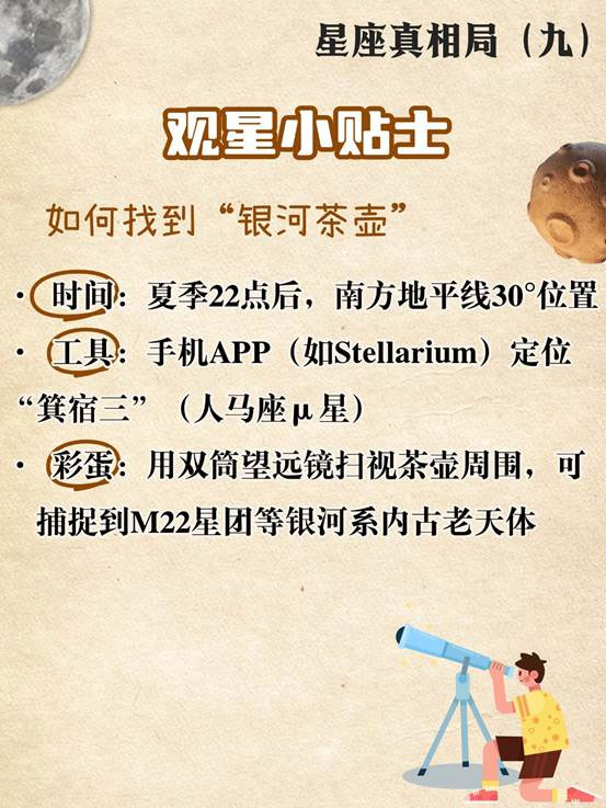· 彩蛋:用双筒望远镜扫视茶壶周围,可捕捉到M22星团等银河系内古老天体