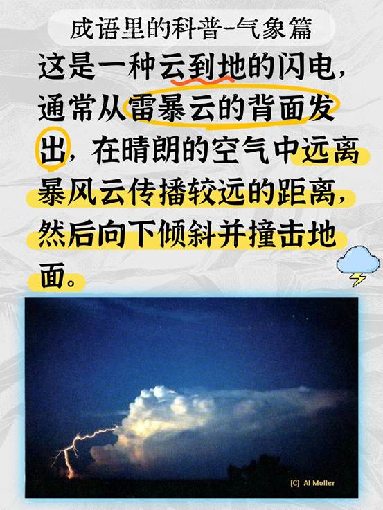 "晴天霹雳"是一种云对地闪电,通常从雷暴云的后侧窜出,在远离雷暴云的晴空中穿行相当长的距离后,以一定角度劈向地面。