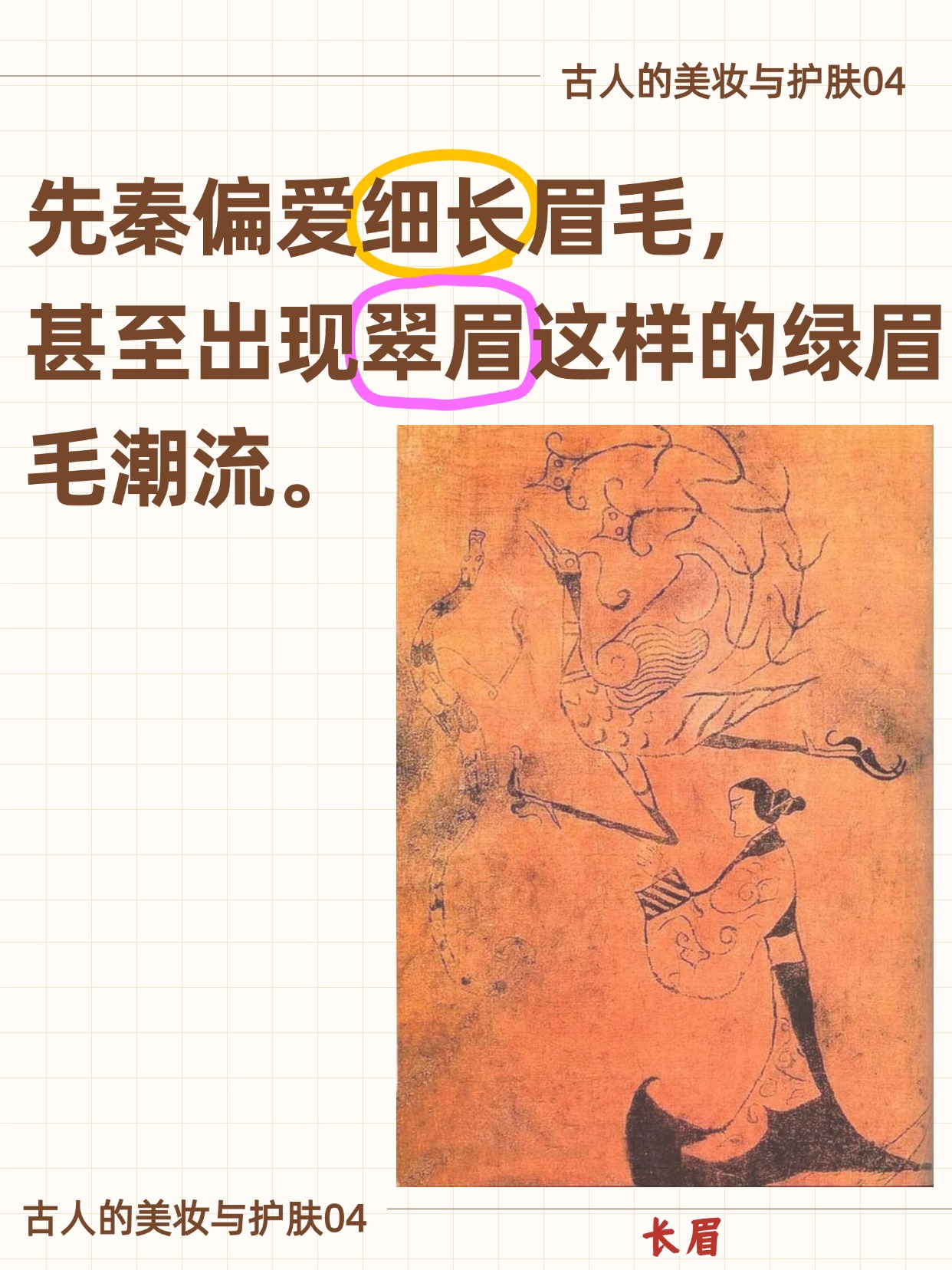 《诗经·硕人》里的“蛾眉”,就是对女子弯长眉形的赞美。先秦时代,人们偏爱细长的眉毛,甚至出现过翠眉这样的绿眉毛潮流。