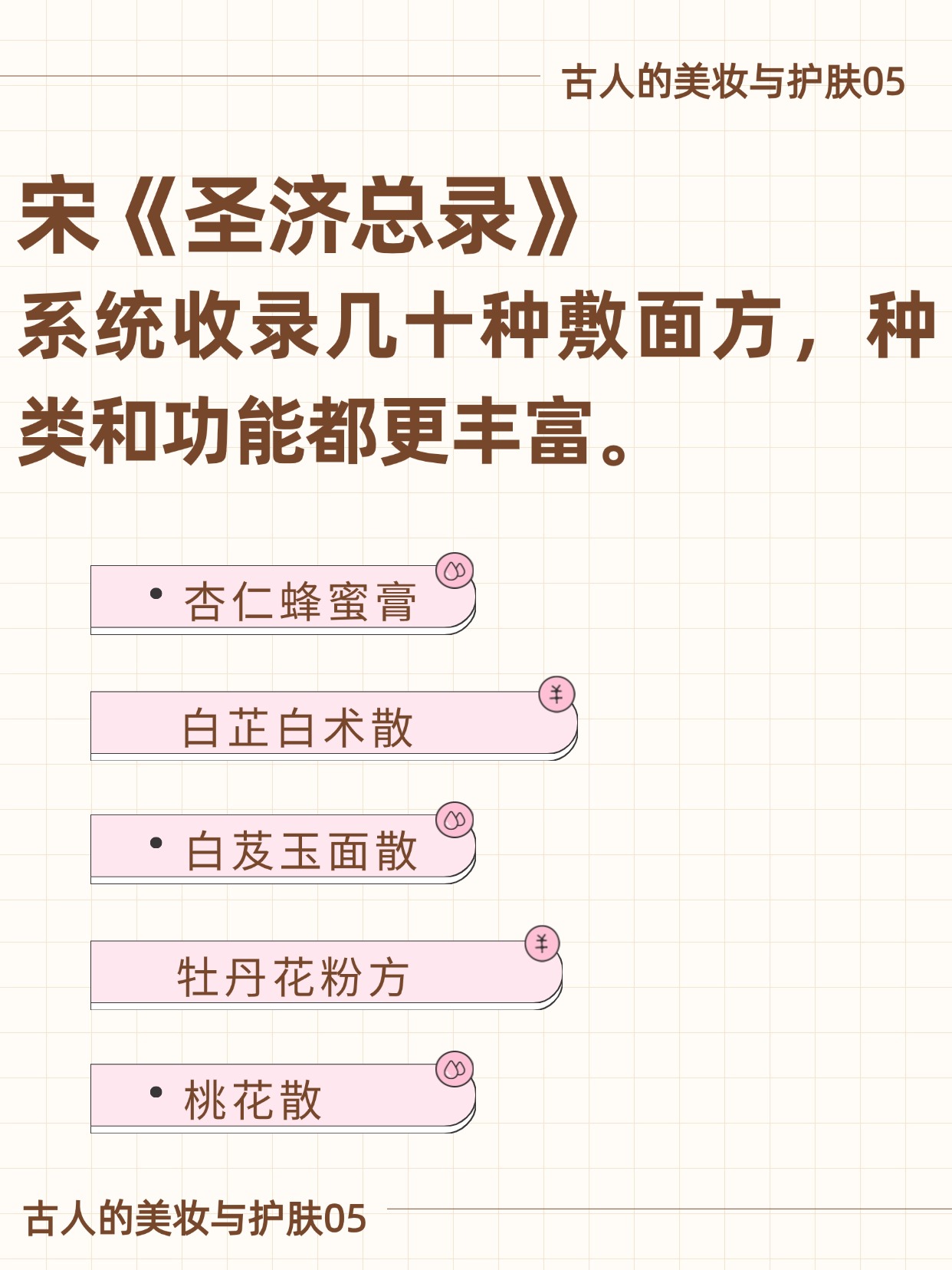 《圣济总录》(宋代医方巨著)收录几十种“敷面方”,包括杏仁+蜂蜜润肤,白芷+白术淡斑,种类和功能都更丰富,堪称古代的“成分党”手册。