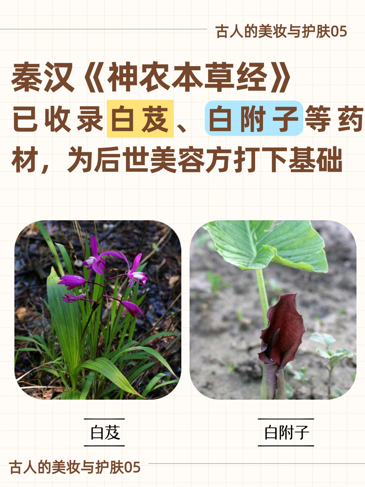 《神农本草经》(东汉前后)已收录白芨、白附子等药材,强调它们的药用价值。虽然当时没写“美容”,但为后世敷面配方提供了原料基础。