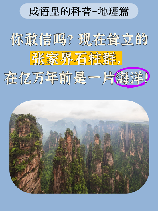 板块运动(搬家):大陆漂移与板块碰撞,能把整片海底在数千万到上亿年的时间里抬升为高山。亿万年前,张家界一带还是海洋,沉积了厚厚石英砂岩。随着地壳抬升,海洋退去,留下了陆地。