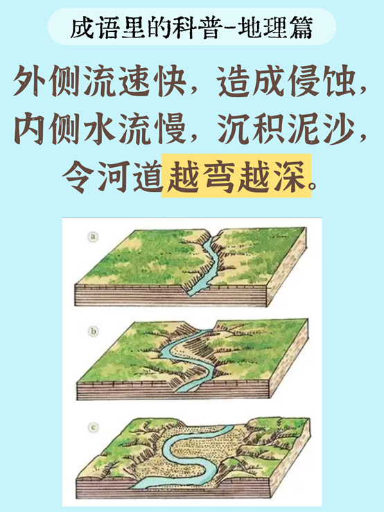 水流速度差异:河中流水在过弯道时,外弯水流速度快,冲刷作用强;内弯(河道内侧)水流慢,容易沉积泥沙。长期作用下,河道弯得愈发厉害。