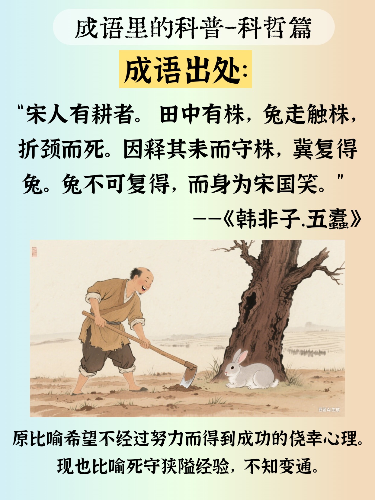 故事大家都熟:农夫偶然捡到一只撞死在树桩上的兔子,从此不再耕作,天天等下一只。最后,田荒了,人也一无所获。