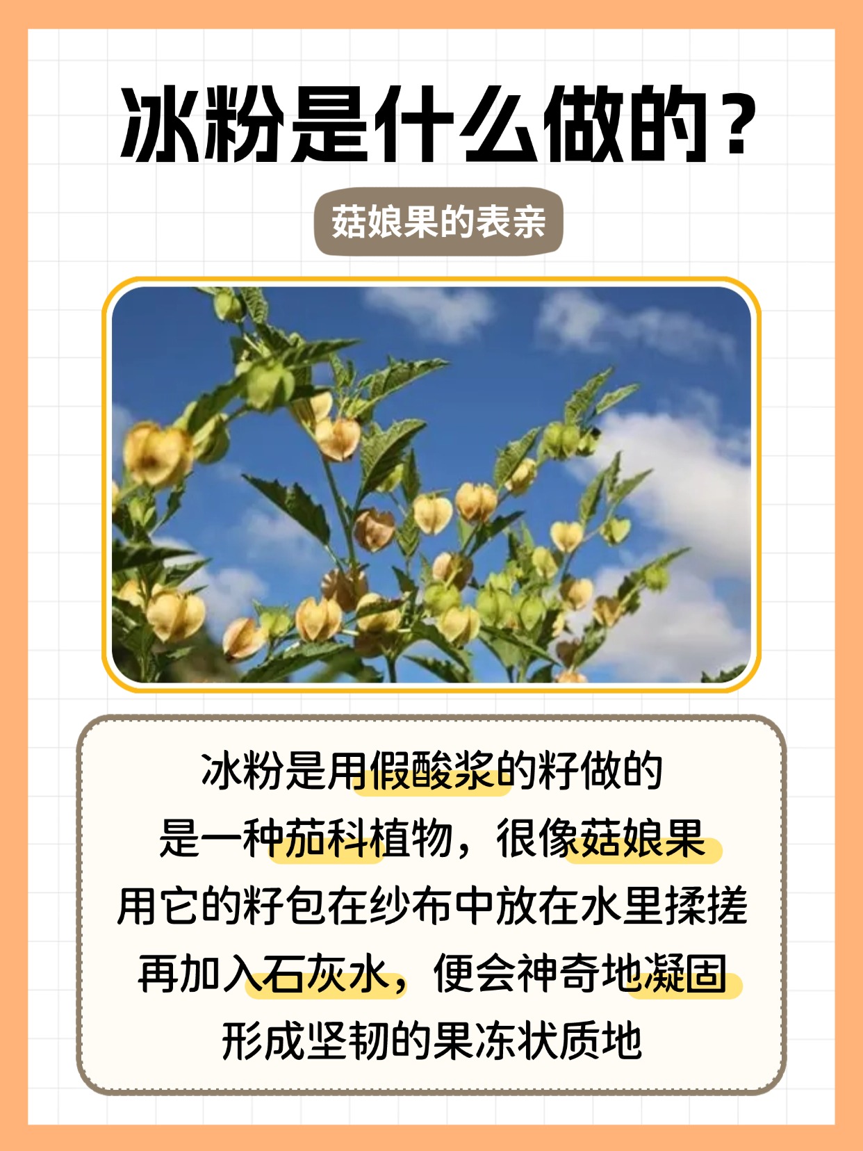 餐桌上总有些搭配,像麻辣火锅配冰粉,简直是天作之合!又麻又辣的火锅遇上清凉甜美的冰粉,冰火两重天,瞬间抚平你被辣到的味蕾,爽到飞起!但你知道吗?冰粉可不是凉粉哦!它的秘密武器是一种叫假酸浆的植物!这货原产南美洲,明末清初作为观赏植物漂洋过海来到中国,现在河北、甘肃、四川等地都能见到它的身影。