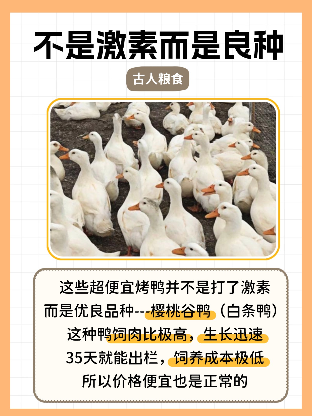 🌱品种大不同:原来这些超便宜的烤鸭,用的可不是普通鸭子,而是优良品种——樱桃谷鸭(白条鸭)!这种鸭子饲肉比极高,长得飞快,35天就能出栏啦!饲养成本这么低,价格自然亲民~