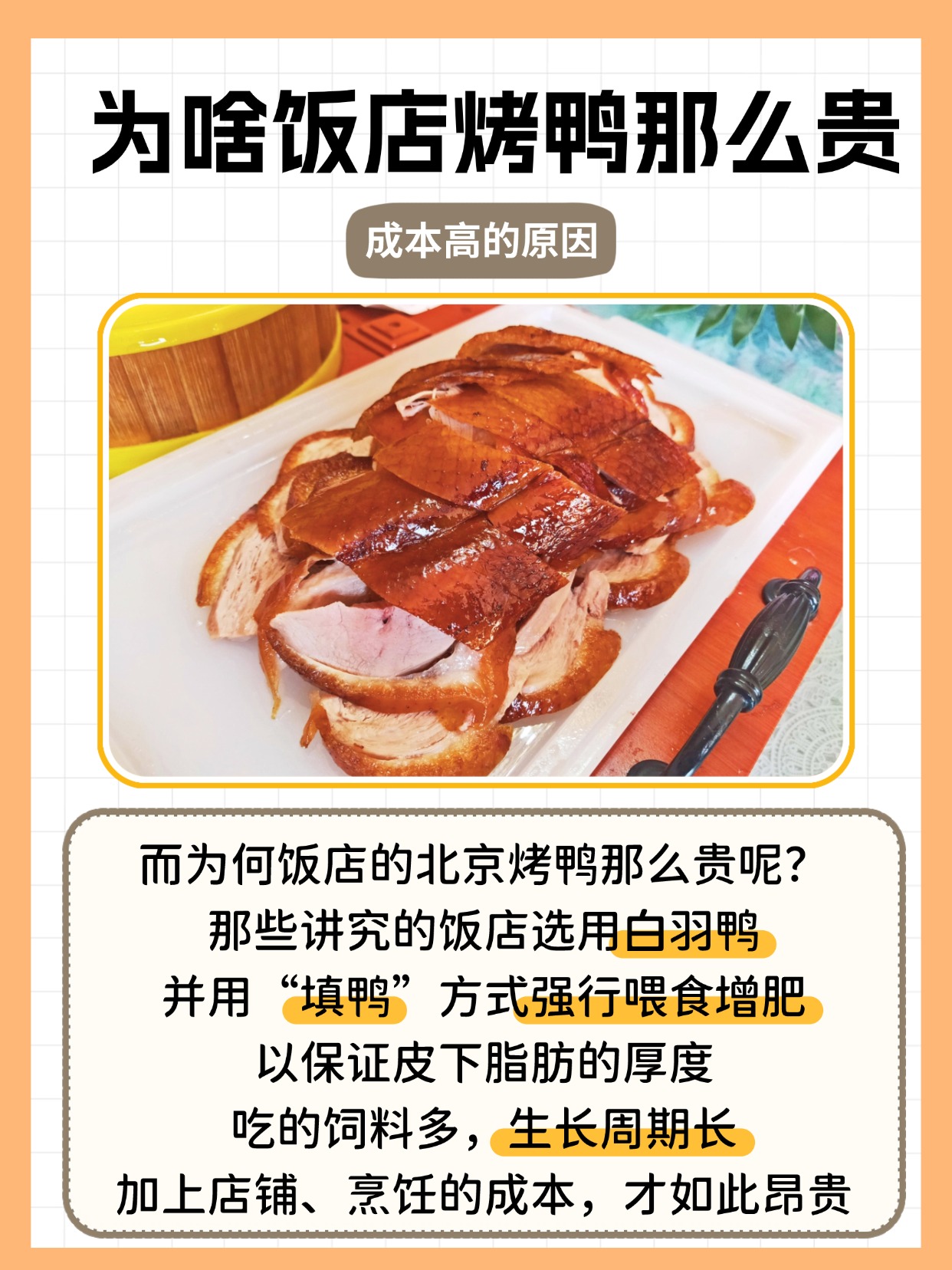🍽️对比饭店烤鸭:那为啥饭店的北京烤鸭那么贵呢?原来,讲究的饭店选用的是白羽鸭,还要用“填鸭”方式强行喂食增肥,保证皮下脂肪的厚度。吃的饲料多,生长周期又长,再加上店铺和烹饪的高成本,价格自然就上去了。
