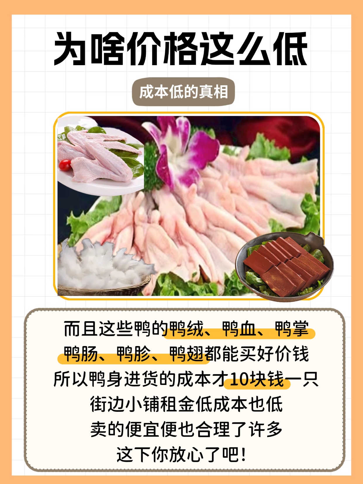 💸全身都是宝:别看鸭身便宜,其实它全身都是“摇钱树”!鸭绒、鸭血、鸭掌、鸭肠、鸭胗、鸭翅……每一样都能卖出好价钱!这样一来,鸭身的进货成本才10块钱一只,是不是超划算?