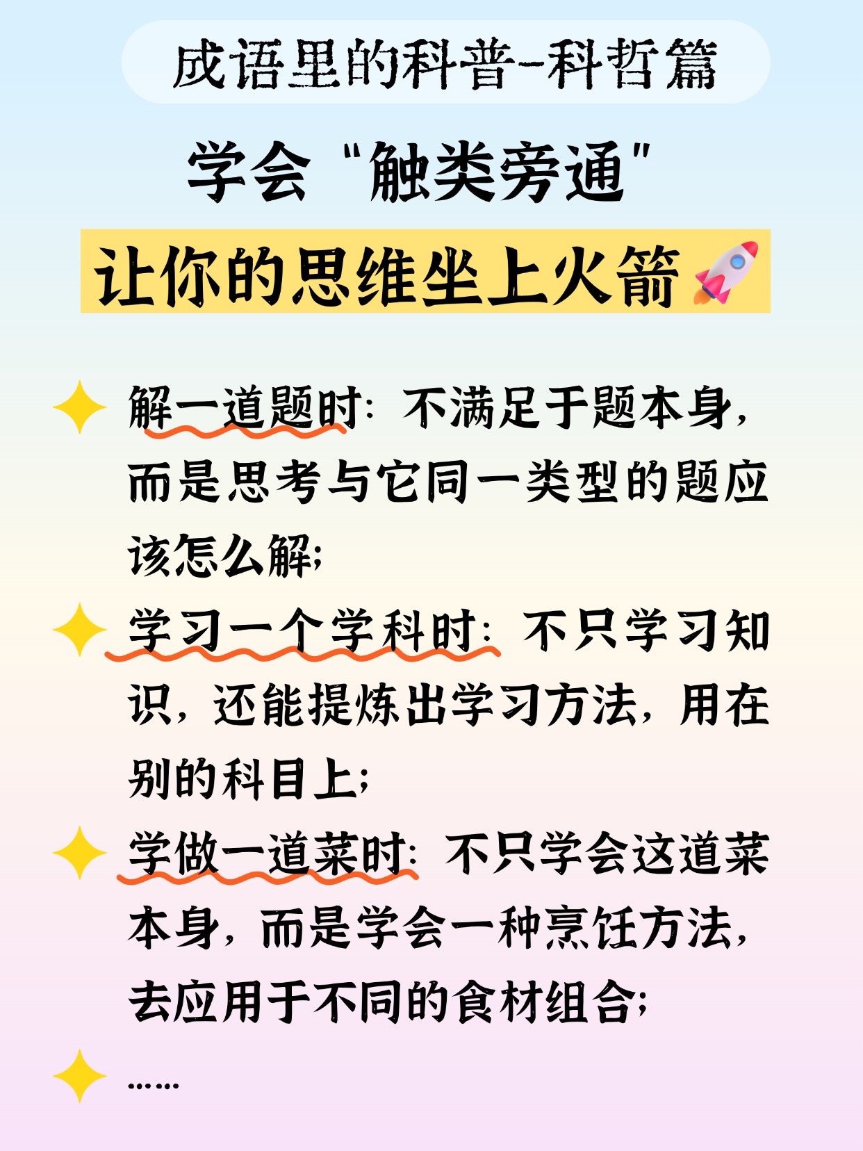 那么,会解一道题,就等于会解很多道题;能学好一个学科,就能学好很多的学科;会做一道菜,就会做很多不同的菜……就像思维坐上了火箭,学习效率也成倍增长了!