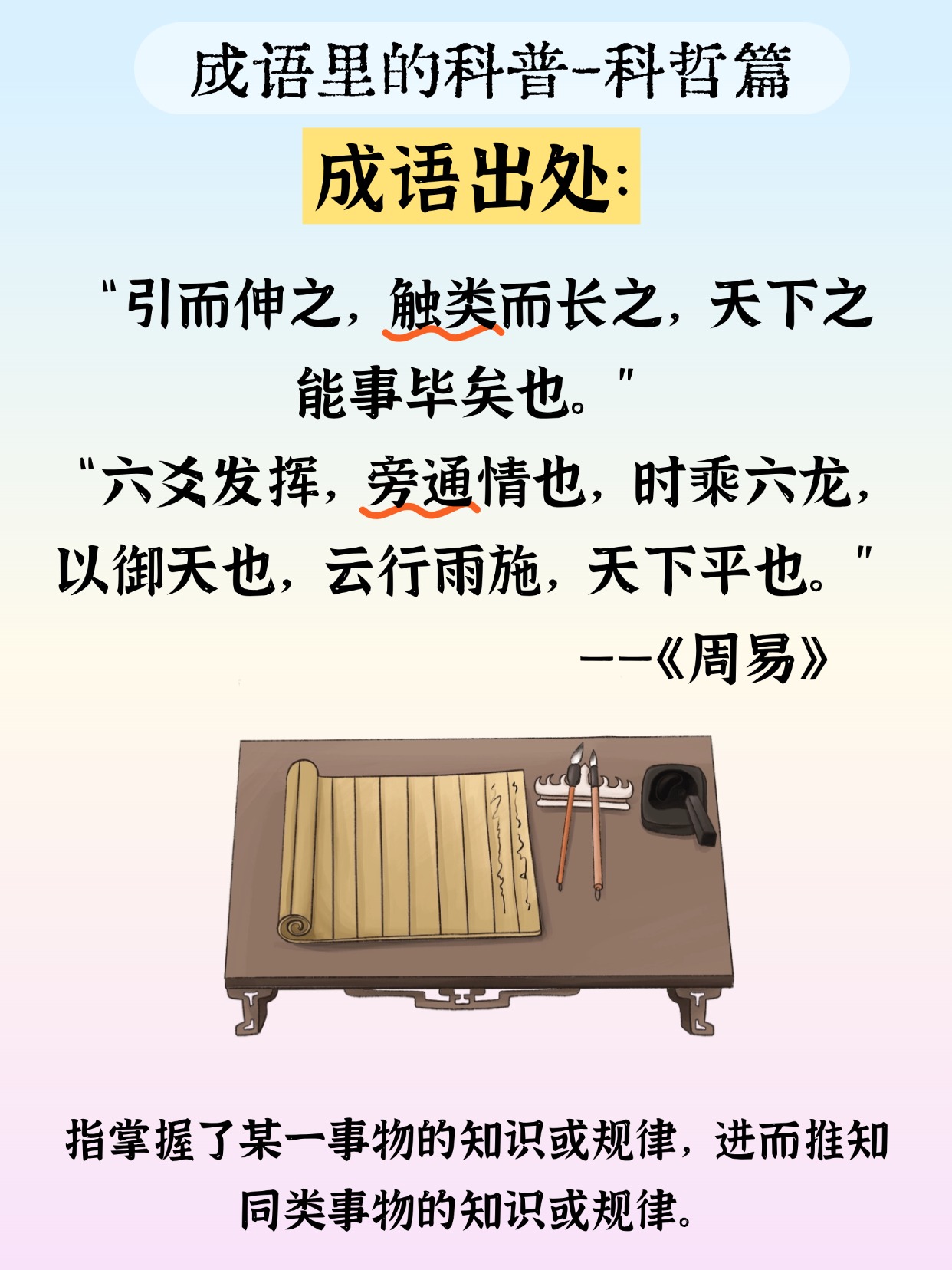 🕸️ “触类”出自《周易·系辞上》:“引而伸之,触类而长之,天下之能事毕矣也。”“旁通”出自《周易·乾》:“六爻发挥,旁通情也,时乘六龙,以御天也,云行雨施,天下平也。”