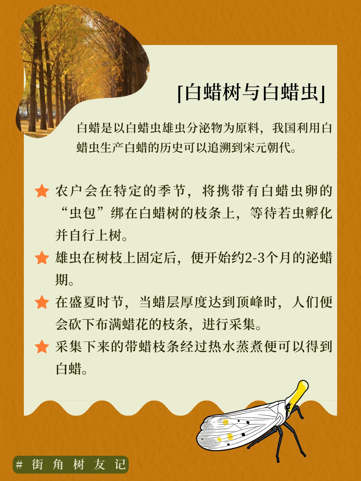 答案是,树本身不会产白蜡,而树上有一种可爱的小虫子生产“白蜡”,那就是白蜡虫。这是一段关于人与动植物之间精妙协作的故事。