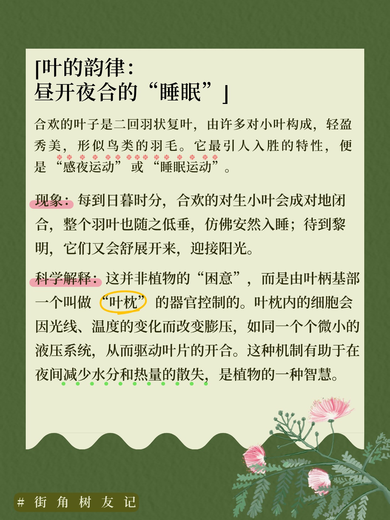 现象:每到日暮时分,合欢的对生小叶会成对地闭合,整个羽叶也随之低垂,仿佛安然入睡;待到黎明,它们又会舒展开来,迎接阳光。