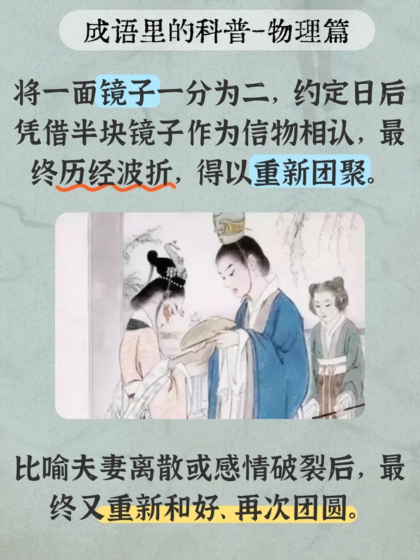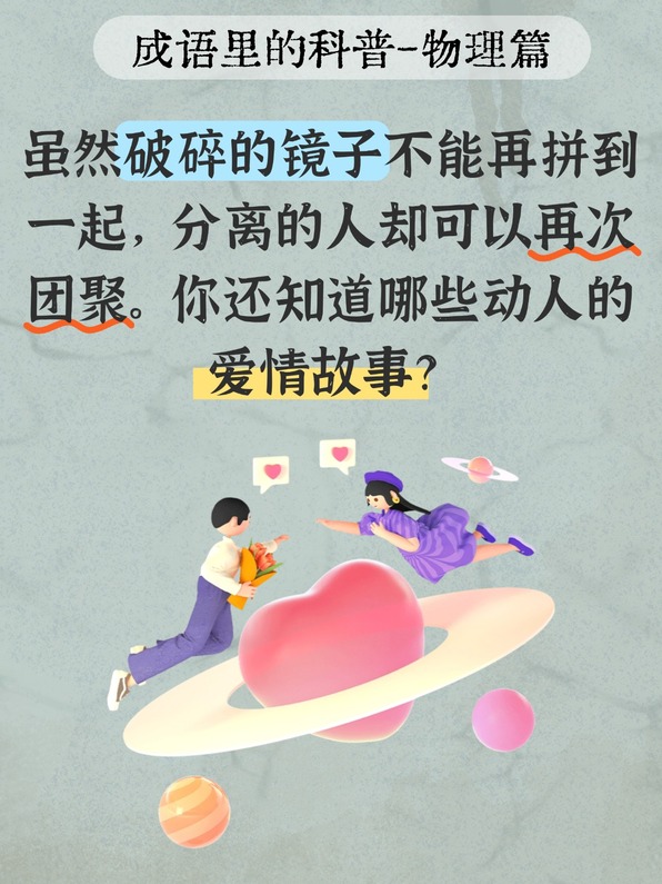 💬 互动话题:虽然破碎的镜子不能再拼到一起,分离的人却可以再次团聚,这就是人类情感有别于物理原理的巨大力量。你还知道哪些动人的爱情故事?快来分享一下吧!