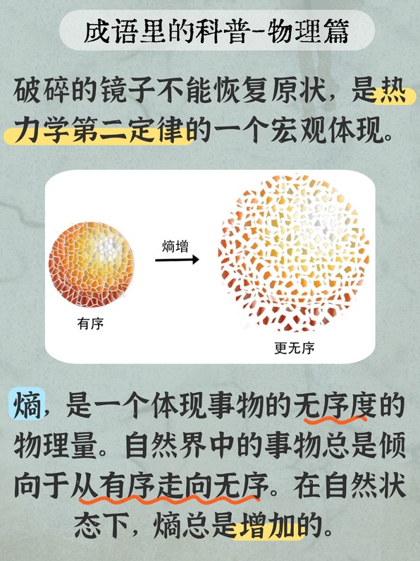 破碎的镜子不能恢复原状,正是热力学第二定律(也就是我们所说的“熵增定律”)的一个宏观体现。
