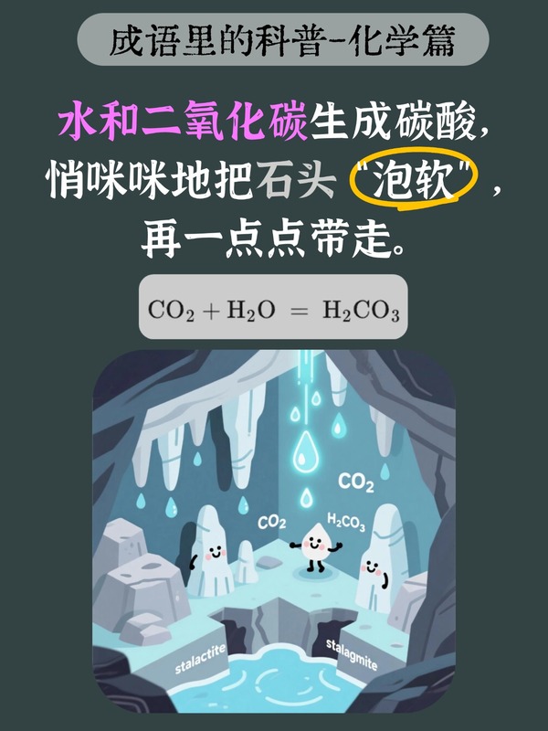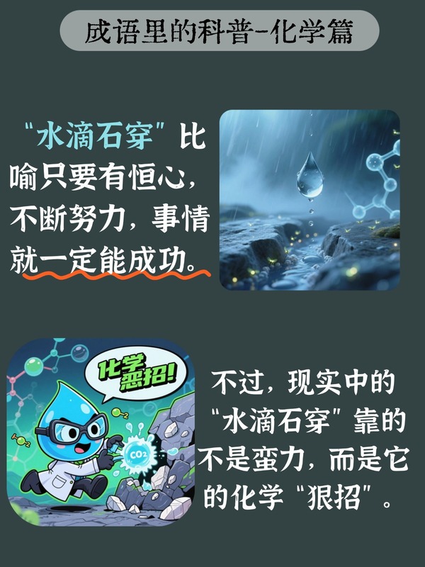 “水滴石穿”比喻只要有恒心,不断努力,事情就一定能成功。我们总以为这是水的“物理攻击”,是长年累月的冲击力。但实际上,水,这位“化学大师”,用的是悄无声息的“化学攻击”。
